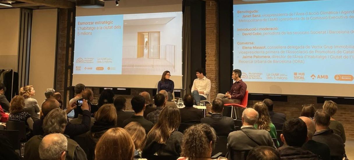 El Pla Estratègic Metropolità de Barcelona (PEMB) ha reunit al Hub Social de Barcelona a Elena Massot, consellera delegada de Vertix Grup Immobiliari i vicepresidenta primera de l'Associació de Promotors de Catalunya i Jaime Palomera, director de l'Àrea d'Habitatge i Ciutat de l'Institut d'Investigació Urbana de Barcelona (IDRA) en una nova edició dels esmorzars estratègics: 'L'habitatge a la ciutat dels cinc milions'. Un debat que ha servit per analitzar alguns dels reptes de l'accés a l'habitatge a la regió metropolitana de Barcelona i explorar solucions que garanteixin un desenvolupament urbà més equilibrat i sostenible. La conversa ha girat al voltant de qüestions clau com la reserva del 30% per a habitatge protegit en centres urbans, el paper del sector privat, l'impacte del mercat immobiliari i la necessitat d'una planificació a llarg termini.