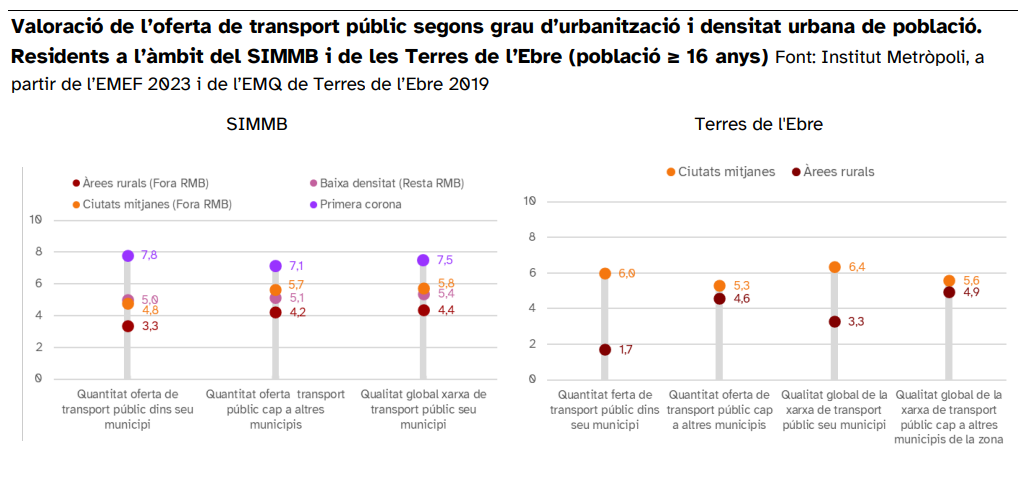 El 61% de la població que viu fora de la primera corona de Barcelona assegura que el principal motiu per no fer servir el transport públic és que l’oferta és inadequada, mentre que a l’àmbit metropolità predominen les respostes de “no el necessito” o la preferència pel vehicle privat. La valoració del servei de transport públic (d’una escala entre el 0 i el 10) suspèn a les zones rurals del SIMMB i Terres de l’Ebre (valors inferiors a 5), mentre que a la conurbació barcelonina arriba al notable (valors superiors a 7).