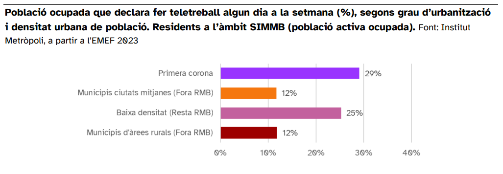 El teletreball, tot i que pot ser una pràctica beneficiosa per a reduir l’ús del vehicle privat i les seves externalitats, ha penetrat amb menys intensitat a les zones rurals del SIMMB. En canvi, té una presència més destacada a la primera corona de Barcelona i a les urbanitzacions de baixa densitat de l’RMB, on el 29% i el 25% de la població activa ocupada declara fer algun dia teletreball a la setmana.
