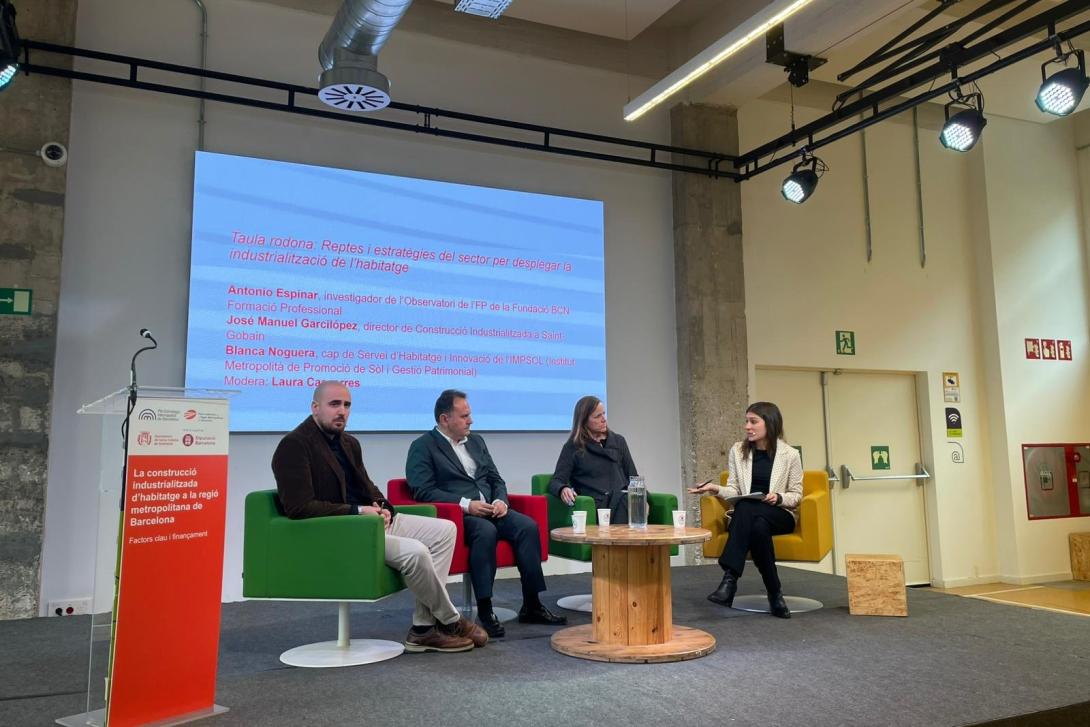 En la segunda parte, dedicada a los retos y oportunidades del salto de escala, tres profesionales analizaron las necesidades del sector desde la formación, la industria y la promoción pública. Antonio Espinar, del Observatorio de la FP de la Fundació BCN Formació Professional, defendió reforzar la formación y reivindicar los itinerarios de FP para asegurar talento, especialmente femenino. Desde la industria, José Manuel Garcilópez, director de Construcción Industrializada en Saint-Gobain, afirmó que el cambio ya está en marcha y reclamó que administraciones y sector avancen coordinadamente. Blanca Noguera, jefa del Servicio de Vivienda e Innovación de IMPSOL (Institut Metropolità de Promoció de Sòl i Gestió Patrimonial), insistió en no renunciar a la calidad arquitectónica y en trabajar de forma alineada desde el inicio, alertando de los condicionantes logísticos de muchos solares metropolitanos.
