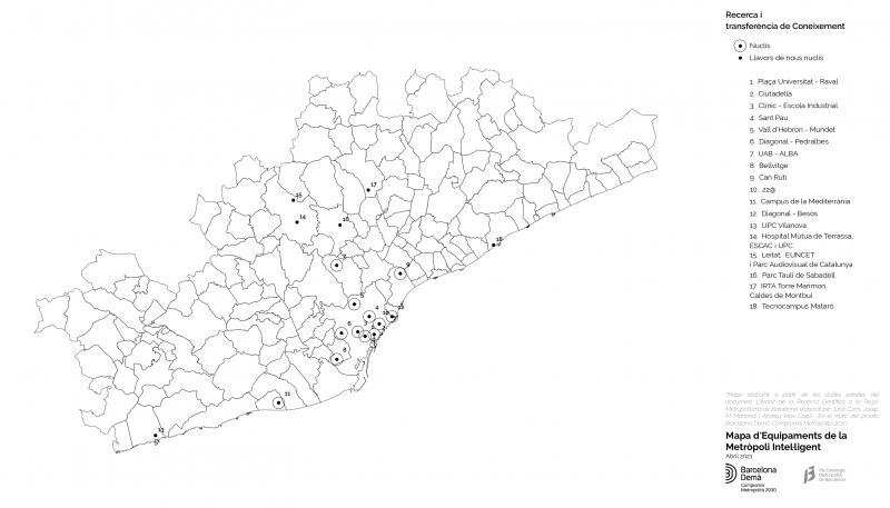L'activitat acadèmica ha permès un posicionament molt destacat de la metròpoli de Barcelona impensable fa 30 anys i ho ha fet a través d'un determinat nombre de nuclis científics, clarament identificables al territori. La concentració geogràfica d'espais de recerca, és un dels punts forts de la generació de coneixement al territori metropolità. Per tal de consolidar i potenciar aquesta concentració seran fonamentals una adequada planificació territorial i energètica, garantir la connectivitat dels nuclis de recerca i impulsar accions per a la retenció de talent captat per aquests nuclis. Així mateix i per tal d'aprofundir en l'impacte social dels centres de recerca, cal reforçar la capacitat del sector públic local i dels espais de participació ciutadana a fi d'incentivar una interacció bidireccional entre les centres de recerca i la societat. Seguidament, el document recull els principals nuclis de recerca de l'AMB i recull algunes reflexions respecte els espais de coneixement de la RMB. Sobre aquests darrers s'expressa que l'estratègia més eficient és seguir l'estratègia que ens ensenya l'experiència: aprofitar al màxim les sinergies de contigüitat, tot orientant qualsevol creixement cap els entorns de realitats ja existents.