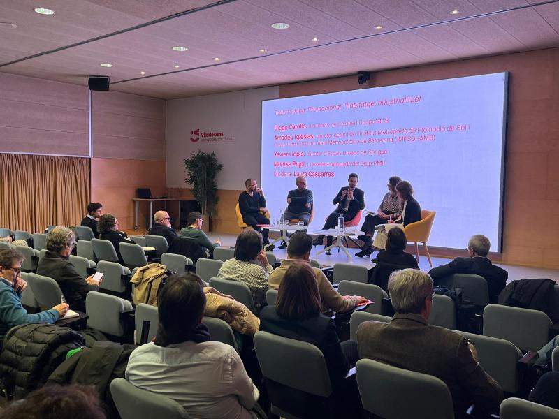 La segona taula rodona va centrar-se en els reptes de fer arribar l'habitatge industrialitzat al mercat, i en la necessitat de superar les barreres financeres i normatives. Montse Pujol, consellera delegada de Project Management Professional, (PMP) va assenyalar que 'cal un canvi de mentalitat en el sector financer, perquè el model hipotecari tradicional sovint no s'adapta a la construcció industrialitzada.' Diego Carrillo, arquitecte de la cooperativa Celobert, va advertir que, tot i les similituds amb el sector de l'automoció, la construcció industrialitzada ha de respectar les particularitats de cada territori. 'És fonamental que integrem la lògica industrial sense oblidar les especificitats locals,' va remarcar. Xavier Llopis, director d'Espais Urbans a Sorigué va demanar no oblidar que també és important la rehabilitació d'edificis, veure quins processos es poden automatitzar, quines normatives sobre eficiència energètica es poden adaptar i millorar la qualitat de vida de les persones que hi viuen.