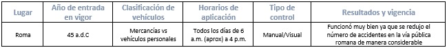 La primera restricción vehicular conocida se remonta a la Roma de Julio César, una ciudad donde, en el año 45 a. C., ya había calles y avenidas completamente colapsadas por el tráfico de vehículos, tanto para el transporte de mercancías como de personas. Ese mismo año se publica el Lex Iulia Municipalis, un compendio de recomendaciones y edictos relacionados con las ciudades. Concretamente y en referencia al tráfico de vehículos en la ciudad de Roma decía: “en esas calles en la ciudad de Roma en las que se produzcan o se vayan a producir trayectos dentro de la construcción cerrada, estará prohibido pasadas las Calendas [principio de mes] de enero conducir y dejar un vehículo de carga desde la salida del sol hasta la décima hora [4 p.m.]”. En forma de tabla esta medida puede resumirse de la siguiente manera: