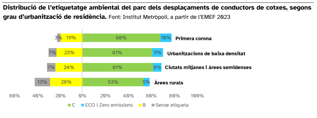 Además, el parque vehicular circulante en los municipios rurales de la provincia de Barcelona es más envejecido y contaminante, con más presencia de vehículos sin distintivo ambiental o distintivo B. En la primera corona y en las urbanizaciones de baja densidad, en cambio, se ha producido más renovación de su flota.