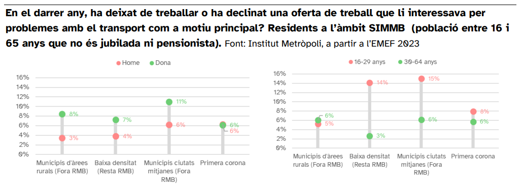 El acceso al puesto de trabajo es otro vector de equidad. Un 7% de la población del SIMMB afirma haber dejado o declinado un trabajo por problemas con el transporte. Las diferencias por sexo se hacen visibles fuera de la primera corona, y los jóvenes son el grupo de población más afectado particularmente a las urbanizaciones de baja densidad y a las ciudades medias. La respuesta debe incluir mejoras de oferta interurbana, coordinación horaria con centros de trabajo y educación, planes de desplazamiento de empresa y soluciones de transporte a demanda para cubrir franjas y recorridos no viables con servicio regular.